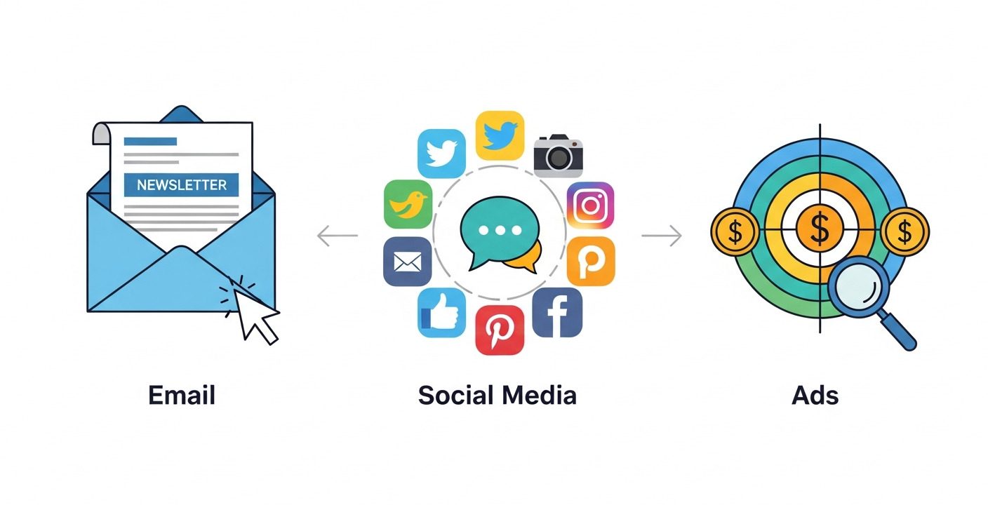 Paid ads aren’t mandatory, but they help scale reach quickly—especially if you want to attract new audiences beyond your existing email list.